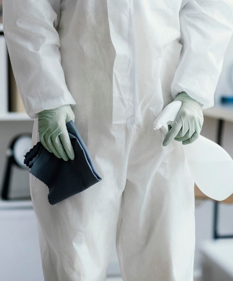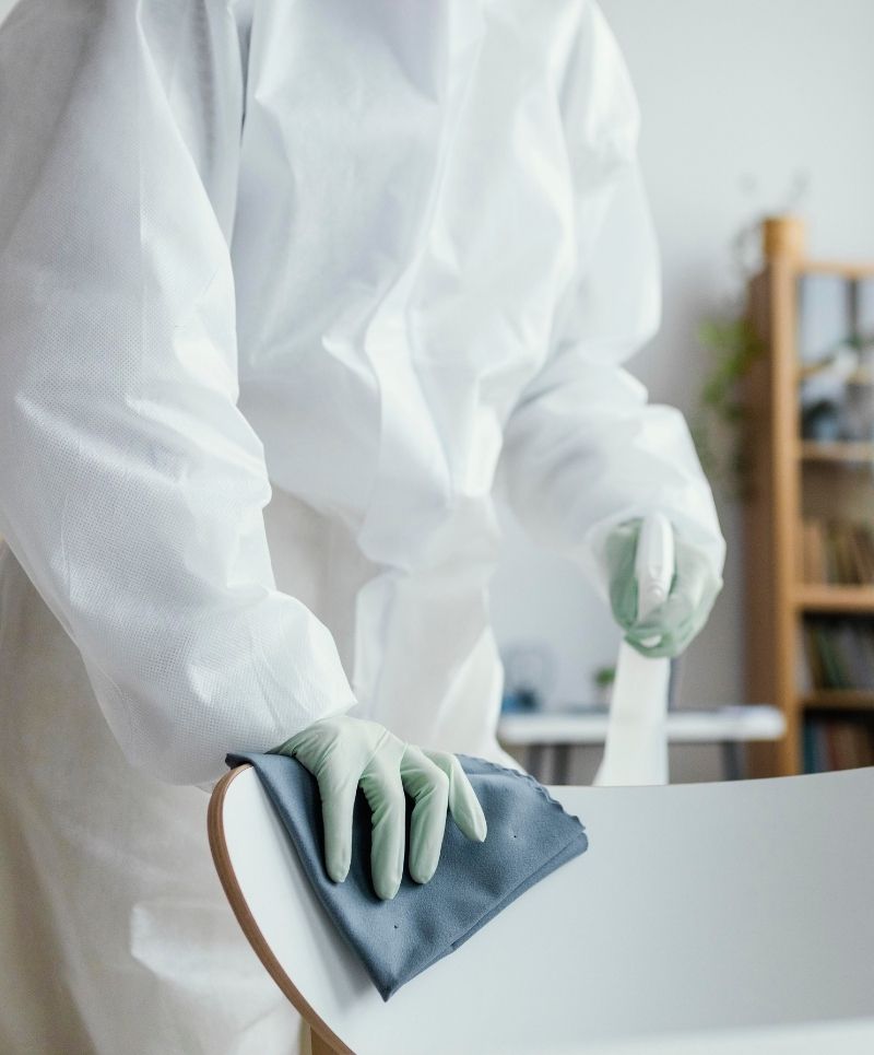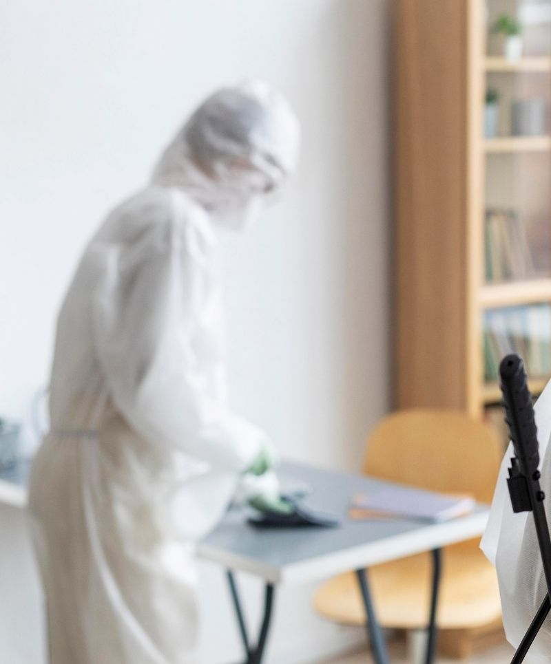 Remoção de sujeira, fluidos e resíduos biológicos, seguida da aplicação de desinfetantes profissionais.